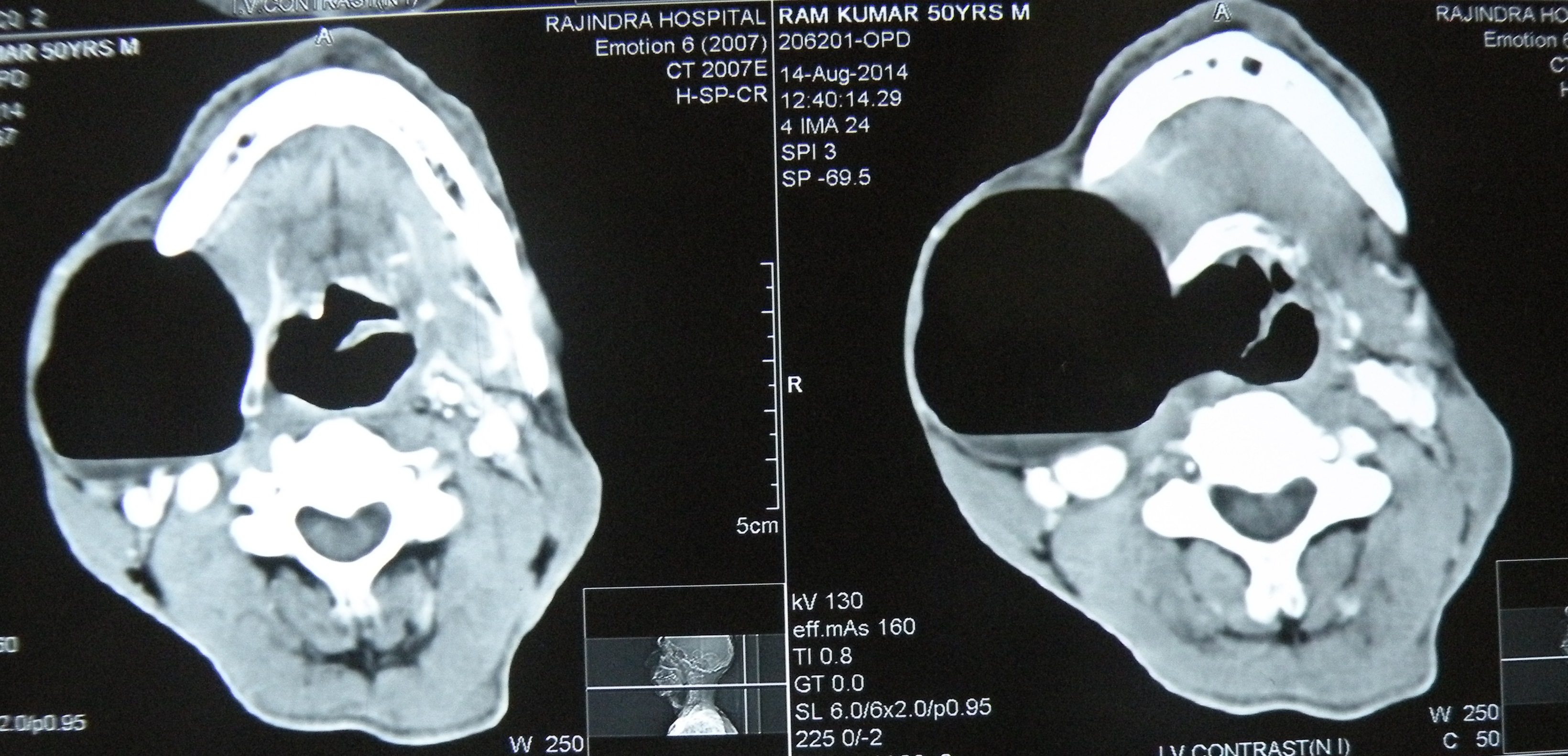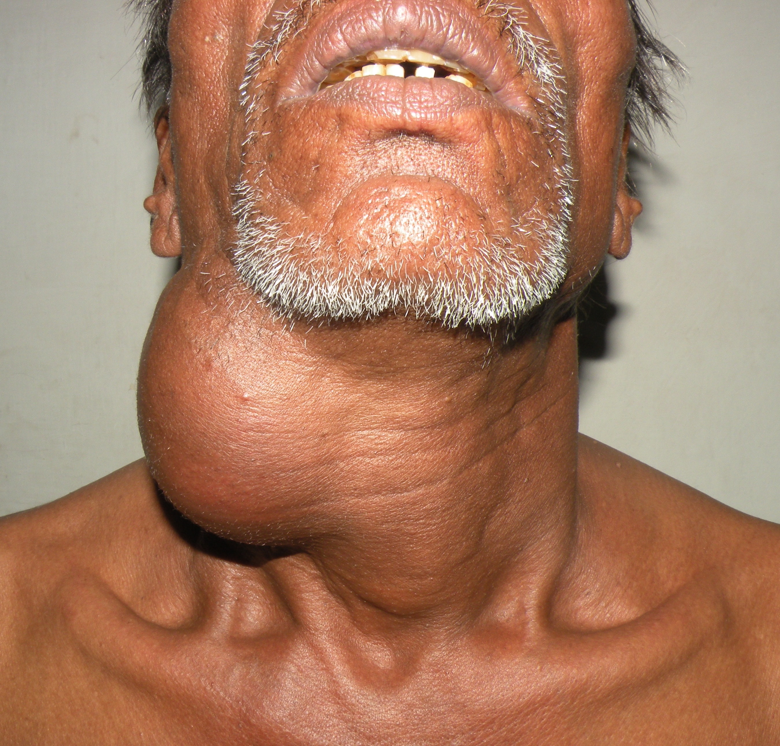 Repaired a large laryngocele for the first time in life!. Had never seen it actually before this one. An old man ( a chronic smoker) had been having a large swelling on the right side of the neck for a long time, and now had been experiencing some pain and hoarseness of voice. ENT examination revealed an internal component of the laryngocele too which had displaced the larynx to the left.